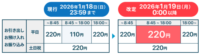 平日営業時間内の「コンビニATMご利用手数料」を、平日営業時間外・土日祝と同じ「220円(税込)」に改定いたします。