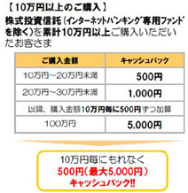 | ご留意事項 | Aコース・Bコース両方の対象となるお客さまへの特典は、いずれか金額が大きい方のみとなります。 Bコースでは両方のお取引を満たす場合や個別のお取引の内容(積立投信のご契約数やネット専用ファンドのご購入金額等)にかかわらず、特典は一律1,000円となります。 キャッシュバックおよびプレゼントは平成26年5月以降、お客さまの投資信託取引に伴う指定預金口座へご入金させていただきます。 |