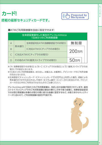 ※ 「A:指静脈認証でのお取引」 ≧ 「B・C:ICチップでのお取引」 ≧ 「D:磁気ストライプでのお 取引」 での設定となります。 ※1日あたりのご利用限度額は、 お引出し、 お振込み、 お振替え、 デビットカードのご利用金額 の合計となります。 ※生体認証ICキャッシュカード・ICキャッシュカードで50万円以上利用した場合、 通帳による 熊本銀行ATMでのお引き出しや他行・ゆうちょ銀行・ コンビニのIC未対応ATM、 デビット カードの当日中のご利用はできませんのでご注意ください。 アレコレnimocaの1日あたりのご利用限度額は、 当初上記の金額が設定されています。 磁気 ストライプとICチップでのご利用限度額は普段の暮らしの中で使う金額に、 指静脈認証設定 でのお取引限度額は多額のお取引の際に使える金額に設定するなど、 お客さまのセキュリティ ニーズに合わせて、 ご利用限度額の設定が可能です。