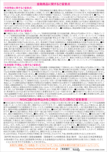 [商号等] 株式会社 熊本銀行 (登録金融機関) [登録番号] 九州財務局長 (登金) 第6号 [加入協会] 日本証券業協会 ※熊本銀行では、 総合口座貸越等の利用による金融商品のお取引は、 貸越利息等をお客さまにご負担いただく ことになりますのでお取扱いしておりません。