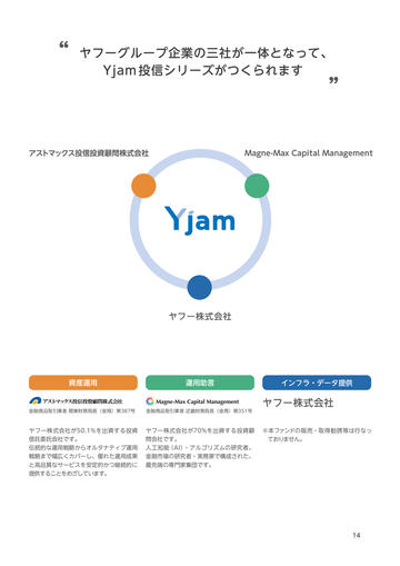 ヤフーと考えた資産運用のあたらしいカタチ。 おカネに働いてもらう楽しさをすべての人に知ってもらいたい という願いを込めて Yjam(ワイジャム)投信シリーズをつくりました。