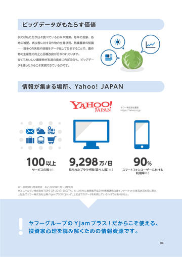 毎日約 1 億人が使うヤフーのサービ ス。そこに蓄積されるビッグデータ には投資のヒン トが隠されています 。