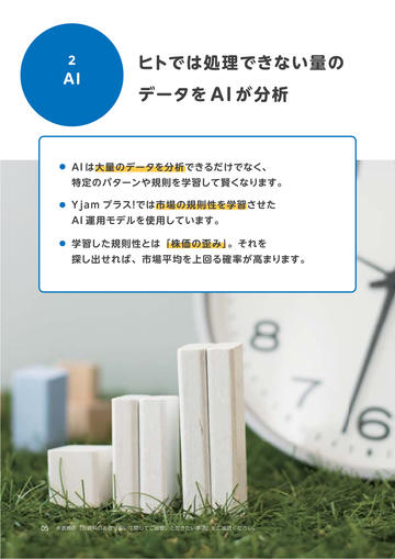 AI は大量のデータを分析できるだけでなく、 特定のパターンや規則を学習して賢くなります。 Yjam プラス ! では市場の規則性を学習させた AI 運用モデルを使用しています。 学習した規則性とは「株価の歪み」 。それを 探し出せれば、市場平均を上回る確率が高まります。