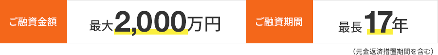 | ご融資期間 | 6ヵ月以上17年以内(6ヵ月単位) ※7年以内(6ヵ月単位)の元金返済据置可(元金返済据置期間中は一部繰上返済はご利用いただけません) |