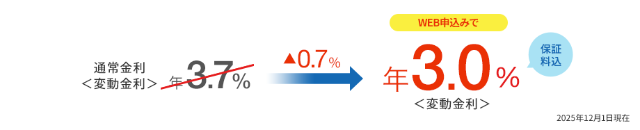- 表示金利は、2025年12月1日(月)~2026年3月31日(火)の間にお申込みいただいた場合の適用利率です。ただし、市場金利の動向によって変更する場合がございます。
